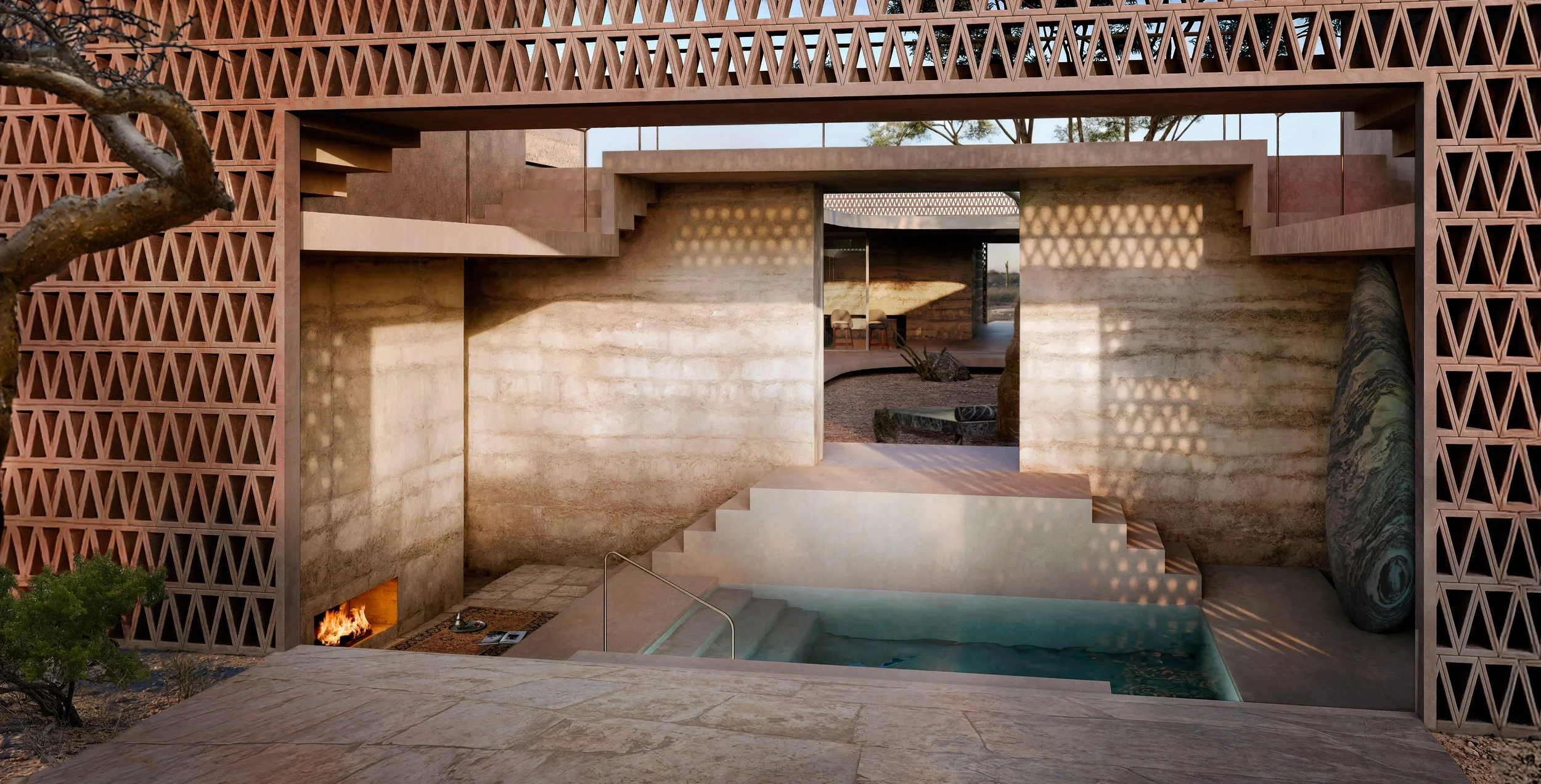 This building is designed to integrate spa living as a means of self-reflection—offering a way to experience ordinary life, differently. A screen of breeze blocks surrounds the structure, filtering light onto interior pathways. This play of light creates a spatial rhythm and sensory experience that suggests a passage of transformation. The architecture is conceived as a space for psychological rebirth. Interior rooms are organized around a central courtyard. Both private and shared spaces are generously arranged to maintain a sense of personal space throughout the building. The structure is optimally oriented to harness natural sunlight and airflow, reducing reliance on artificial lighting, heating, and cooling—significantly lowering its carbon footprint