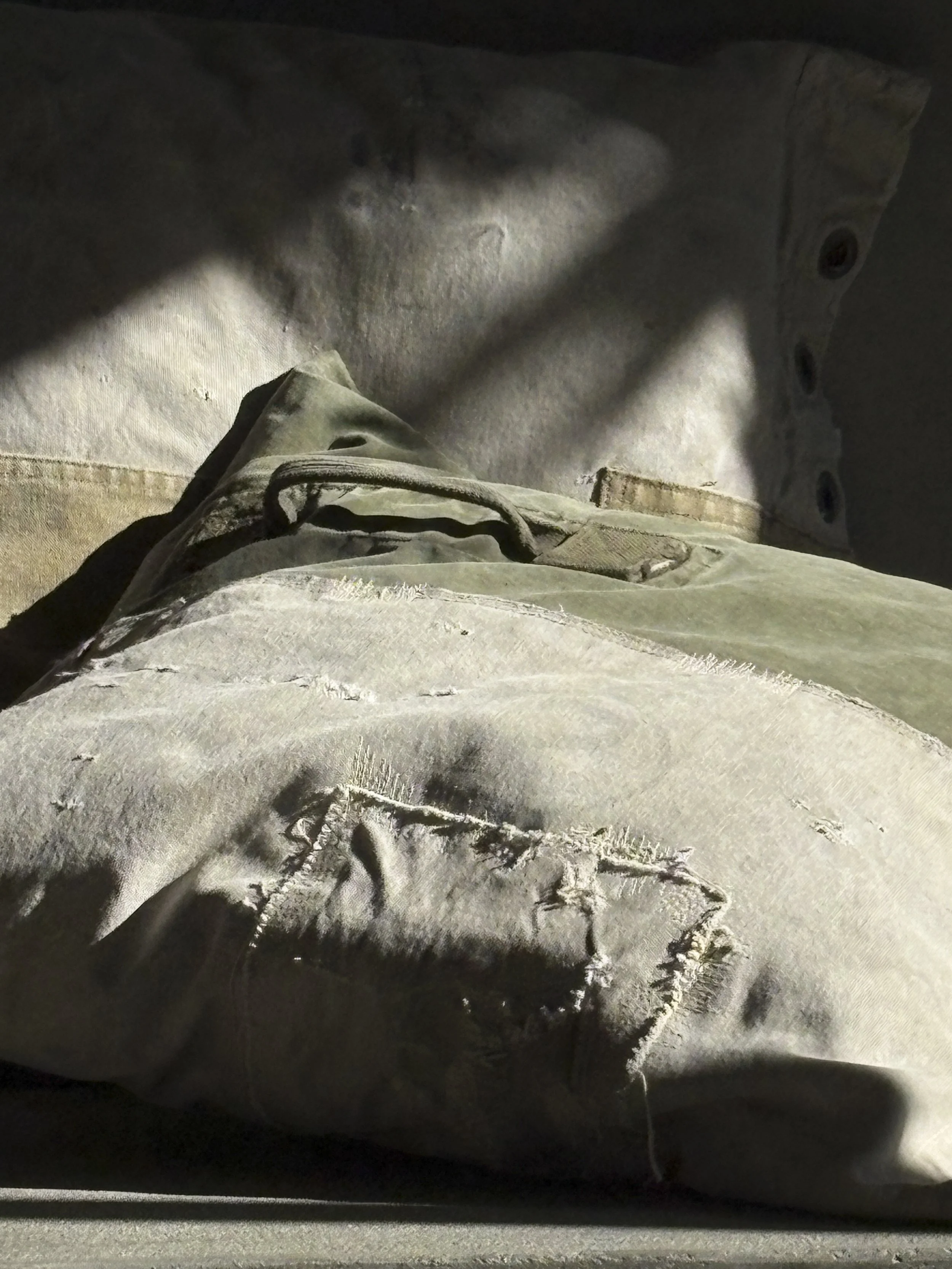 The vintage fabric tells a story, it has holes, patches & stains, and has beautifully weathered in time. A recognition of the past connects us to the now.