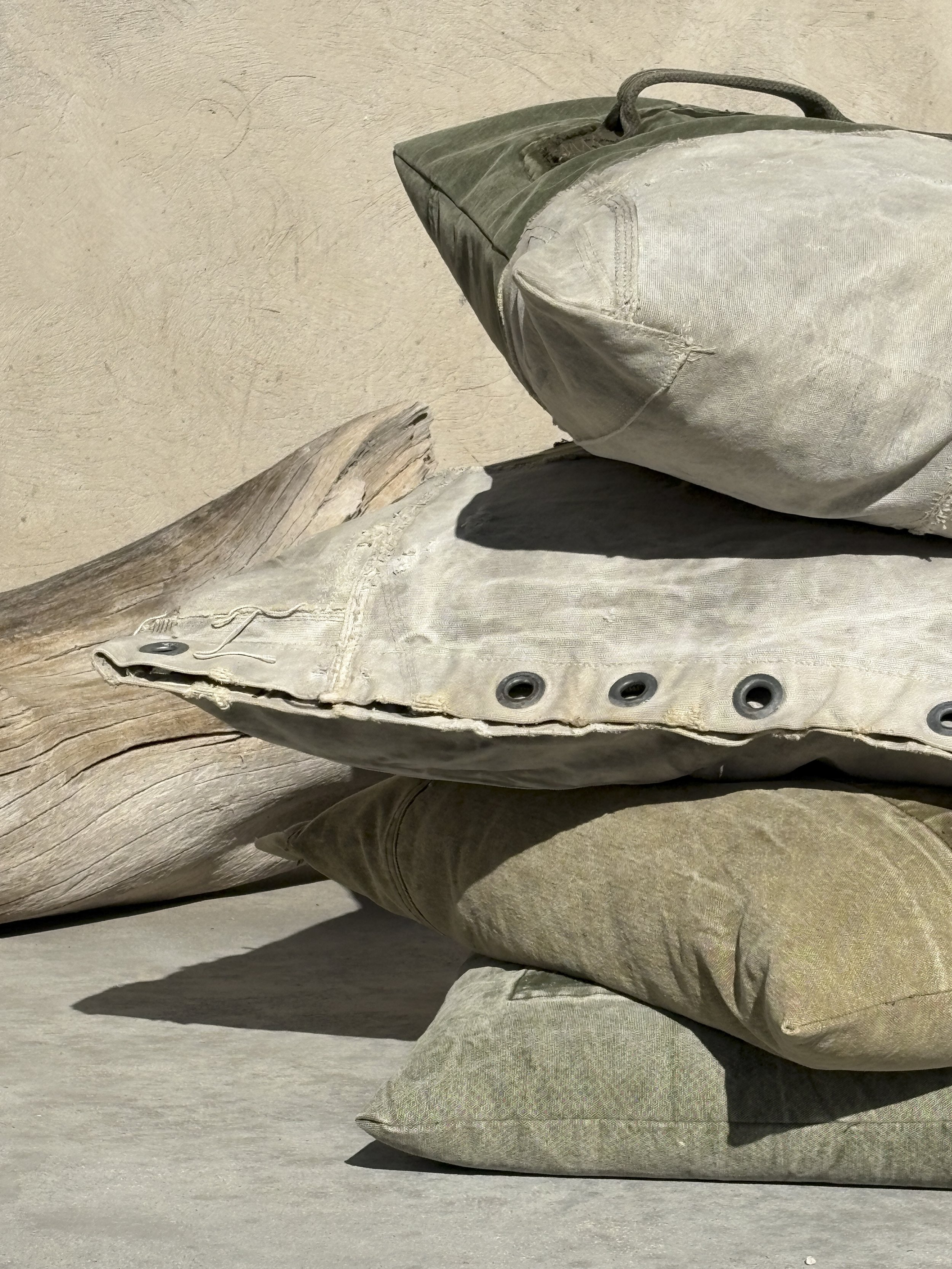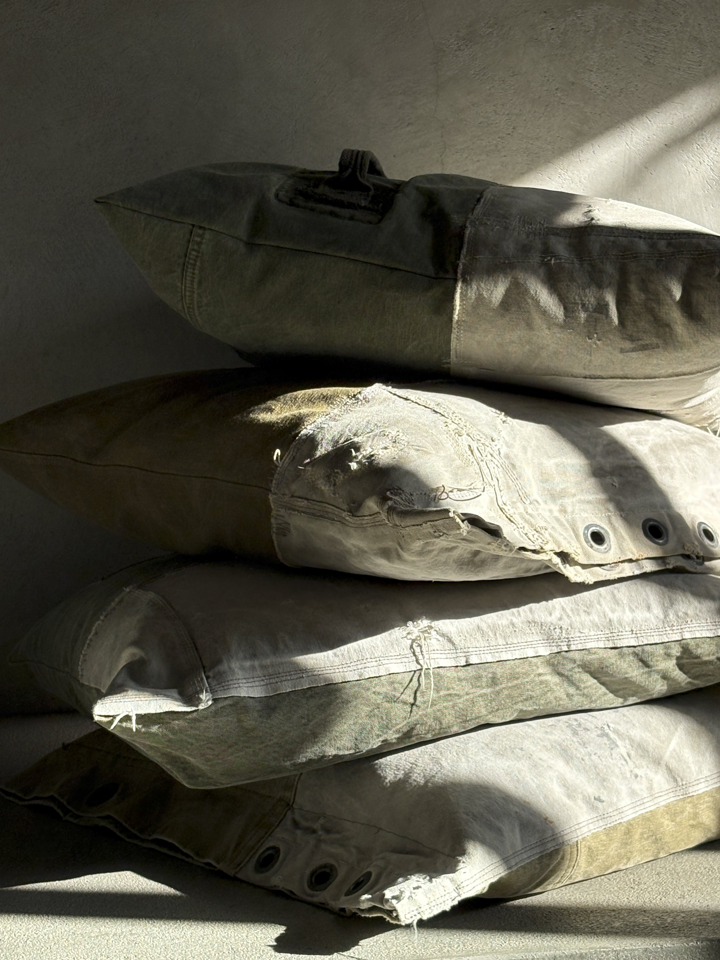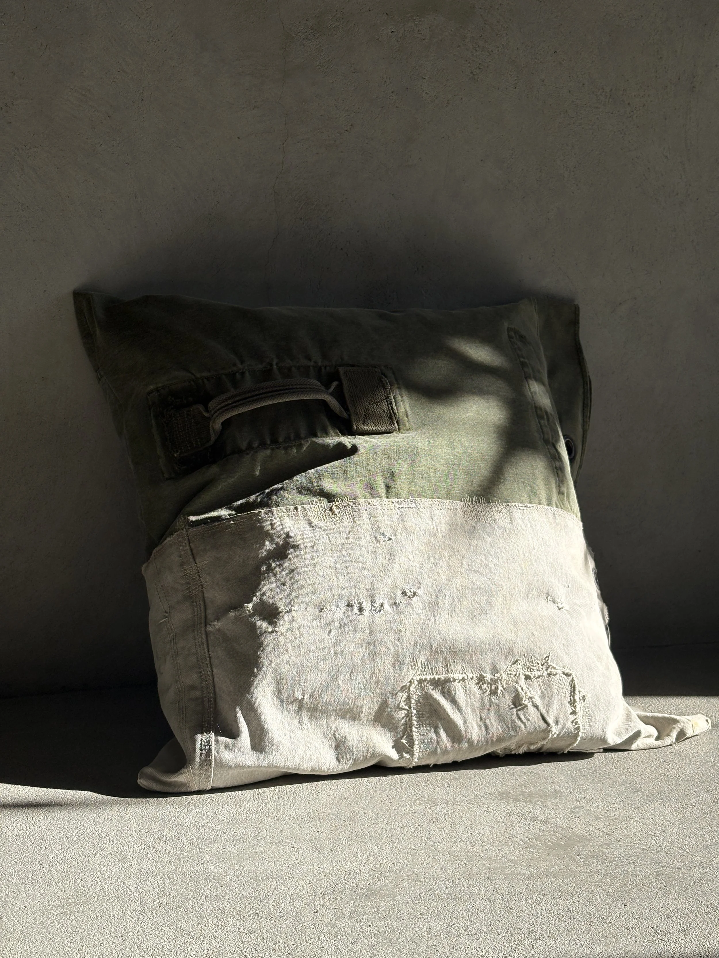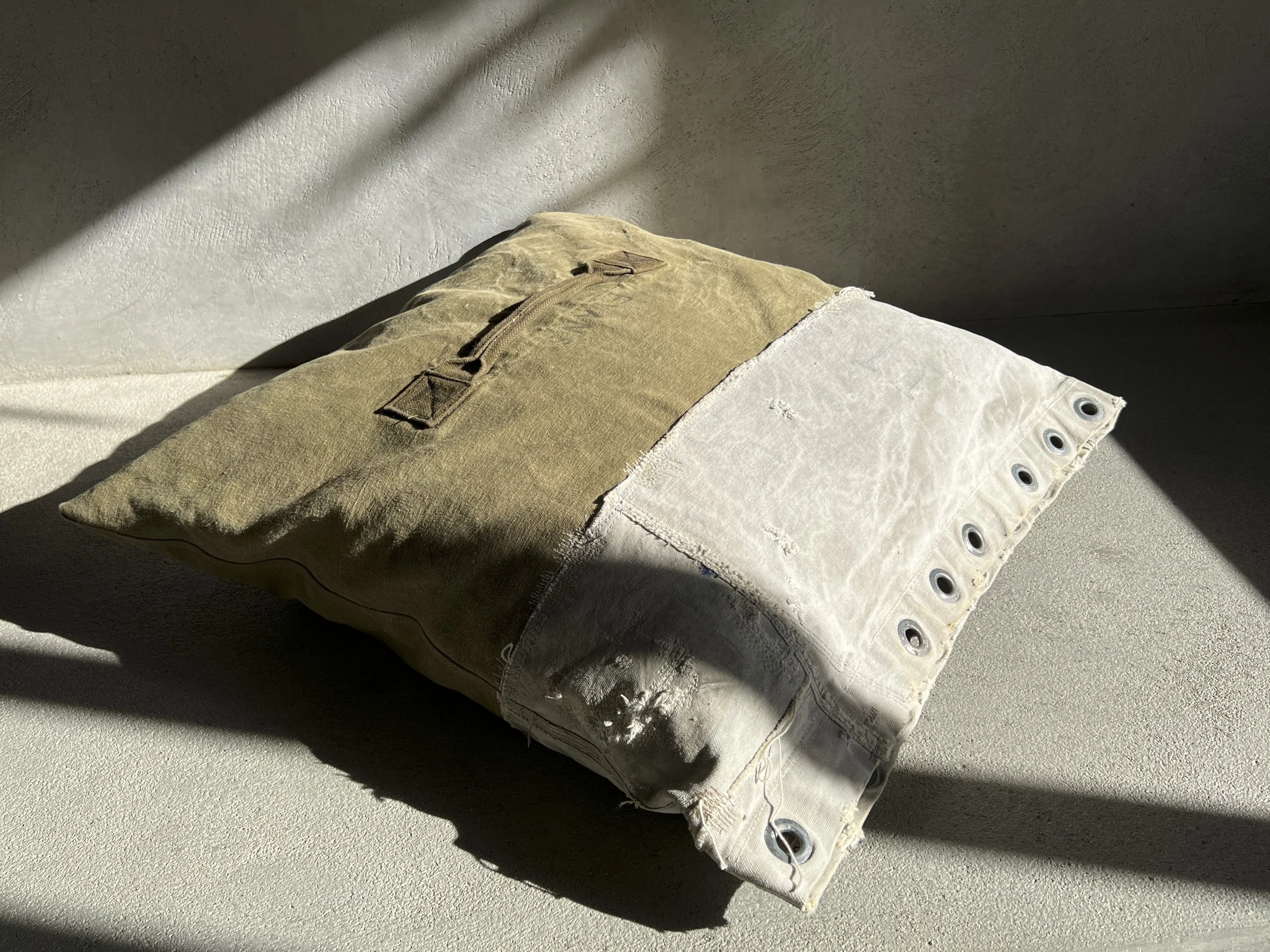 Our DUO-TONE cushion is the humble marvelic of our latest collection. It brings together durable fabrics that have stood the test of time, sourced from vintage U.S. mail bags and military duffle bags. Thoughtfully designed from hand-picked materials, each piece becomes a subtle, understated beauty, adding softness and comfort to the living space.